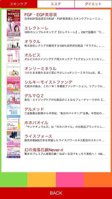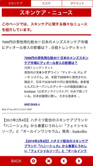 「ビューティ・マニア」は美に関する情報を得られるアプリです。スキンケア・エステ・ダイエットの3つのカテゴリを用意、最新のニュースや商品を紹介します。ランキングメニューもあるので、タッチすれば人気商品が一目でわかる!美容商品を購入するときにオススメ、女子力をアップを目指したい女性に最適です。気になる商品の名前をタッチすれば外部サイトに移動、商品に関する詳細な情報も閲覧できます。商品に関する口コミも投稿できるので、お気に入りの商品の使用感を紹介してみましょう。もちろん、商品ページから他の人の口コミも閲覧可能、複数の商品を比較検討したい時に役立ってくれるアプリです。