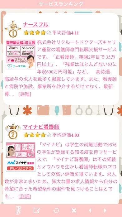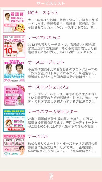 App Storeより引用看護師の方に朗報です!給料や待遇面を改善したい方、勤務先の人間関係にお悩みの方、 キャリアアップを目指したい方など、理想の職場を模索している方への指針となるアプリが誕生しました!就職・転職の支援サービスも沢山あるので、どれが自分に最適なサービスか決めるだけでも大変です。そんな時にはこの「看護師求人ナビ」!実際にサービスを利用されたみなさんの評価投票でランキングを作っていく新しいアプリです。その他、厳選した支援サービスの掲載や看護師関係の最新ニュース配信など、きっとあなたのお役に立ちます。より良い明日のために、迷ったらまずこのアプリをダウンロード!