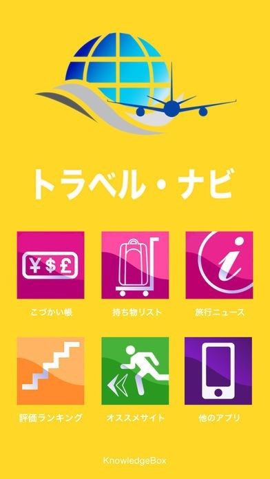 App Storeより引用旅行好きなあなたのお役に立ちます、とても便利な「トラベル・ナビ」!お買い物の際に役立つシンプルな「こづかい帳」や準備に役立つ「持ち物リスト」に加え、お得な「オススメサイト」や「評価ランキング」、最新の「旅行ニュース」まで盛りだくさんの内容です。旅行を思い立ったら、まずこのアプリをダウンロード!トラベラー必携のアイテムです。