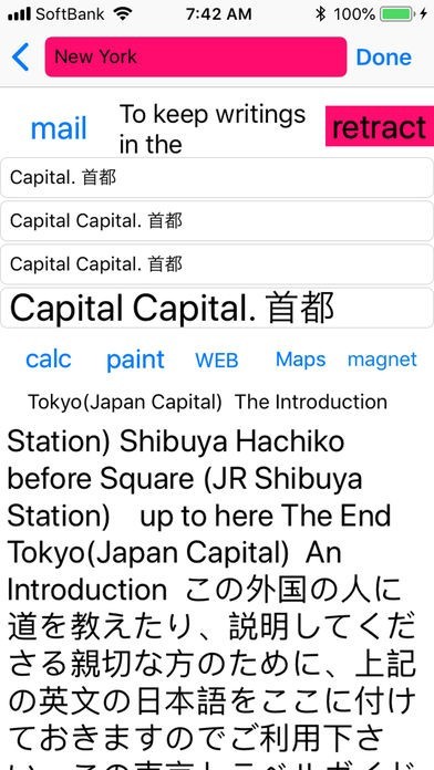 App Storeより引用この東京の旅行ガイドアプリは、本当の東京らしい場所の一覧をこの短い文章の中に込めてあります。それに加えて、街歩きに必要な地磁気に反応して地図ごと北向きにぐるっと回るウォーキングマグネットマップとメモを取るのに便利な5つの記憶欄を持つ記憶装置、簡単なメモもかける計算機もつけてあります。詳しいことを知るには、今ではインターネット上の 通常の旅行ガイドで得ることができるようになっていますから、詳しいこと、例えばどうやっていくとか画像とかお店の名前などはインターネットで調べてみることができます。