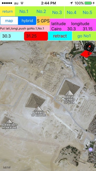 磁石(コンパス)と6種のGPS地図と緯度経度表示地図のスクリーンショット