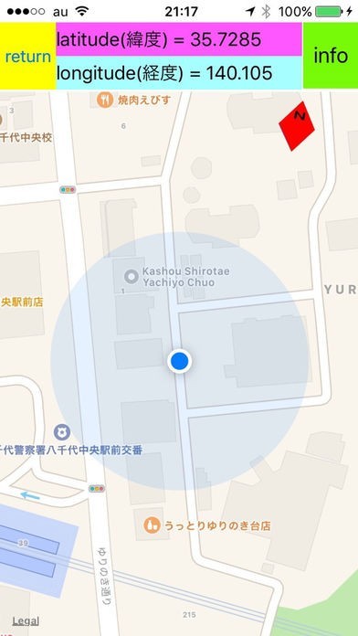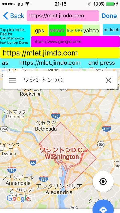 h01 GPS付きマップ、現在地の緯度経度、メモとインターネット付きのスクリーンショット