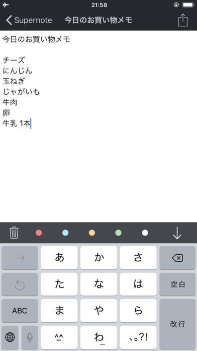 「メモ帳 - Supernote - シンプル、クラウド同期」は、必要な時にサッとメモをとって、用が済んだらすぐに消してしまう・・・という、メモ本来の機能に的をしぼってデザインされています。そのため、いろいろな付加機能は特に必要なく、メモの作成と管理だけをおこないたいという方に向けたとてもシンプルなメモアプリです。作成したメモはタッチして順番を並べ替えたり、削除したりすることができますし、メモを探したいときにはキーワードで検索できるようになっています。必要に応じてメモの内容をSNSで共有することもできるので、買い物リストやToDoリストをグループで共有したいときにも便利です。