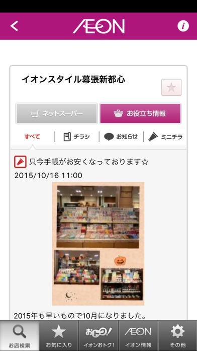 イオングループが展開するショッピングセンターやスーパーマーケットのマックスバリュ。毎日のように利用される方も多いと思います。 このアプリはイオンでお買い物する方にはぜひ使って欲しいアプリ!かさばるチラシをスマホでサッとチェックできるのはとても便利です。 難しい操作は一切なく、起動すればすぐに現在地周辺のイオングループ店情報が見れると言う手間いらず。 お気に入り店舗を登録しておけば、チラシを更新した時にこのアプリが素早くキャッチ!おトクなお買い物に役立つアプリです。
