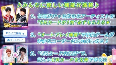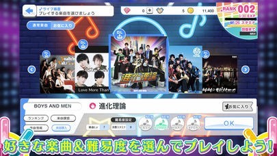 「BOYS AND MEN」「祭nine.」など、現在人気上昇中の男性アイドルグループの楽曲が搭載されており、お気に入りの曲や推しグループの曲でリズムゲームを楽しめます。