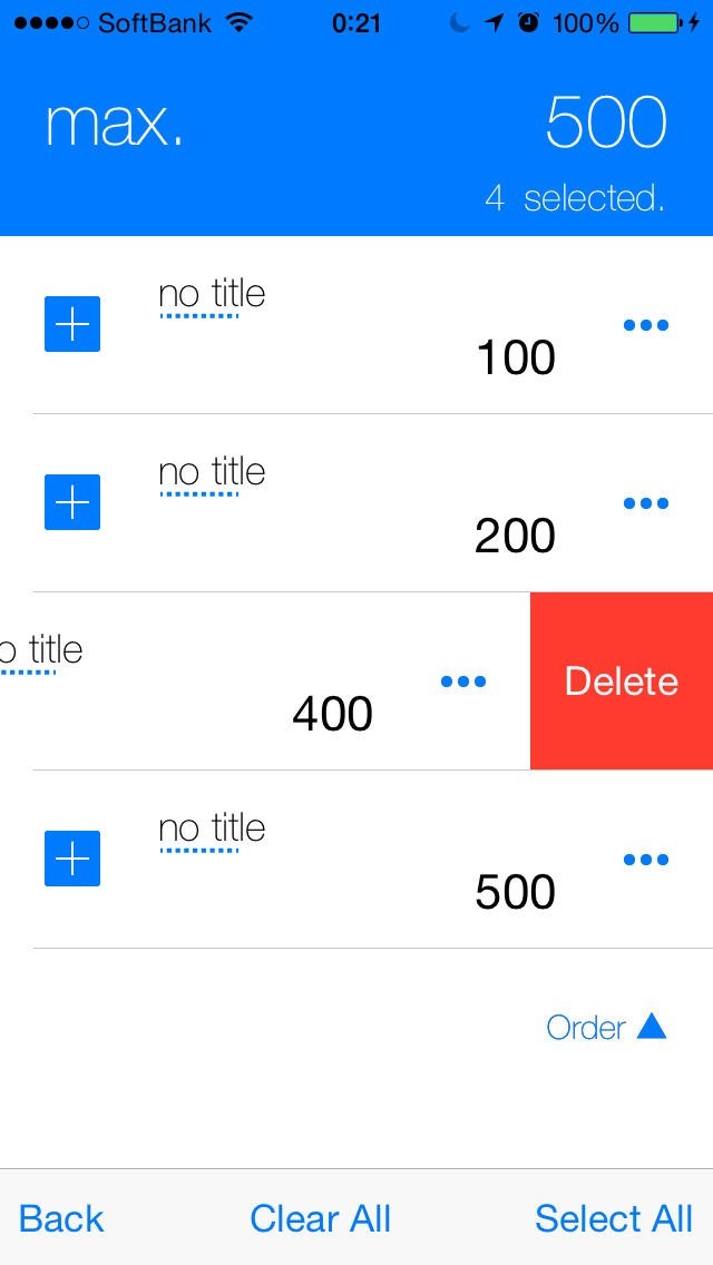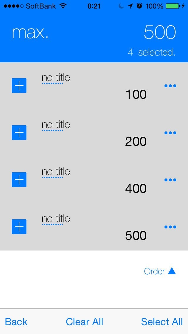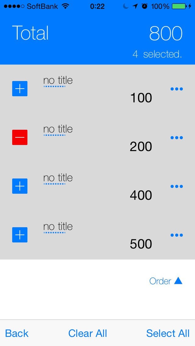 m+Calc電卓は、そんなメモリー機能を使い易くした電卓です。メモリーした小計をテーブル形式で一覧し、テーブル上で足したり、引いたり、並べ替えたり、合計から取り除いたりできます。各小計にはタイトルをつけることもできます。