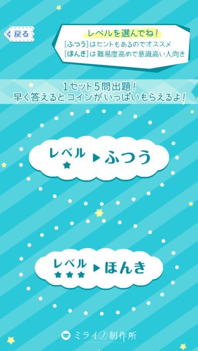 アプリには2種類のレベルが用意されています。はじめはふつうレベルから、慣れてきたらほんきレベルに挑戦しましょう。自分の実力に合わせて、難易度を選ぶことができます。