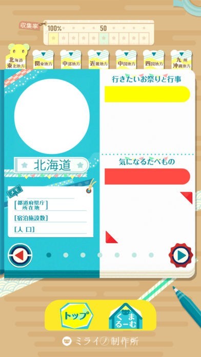 クイズに答えると、内容が図鑑ノートへ記録されていきます。各都道府県の県庁所在地、宿泊施設数、人口、気になるたべものなど、色んな情報が追加されていきます。色んなクイズに答えて図鑑ノートを完成させましょう。