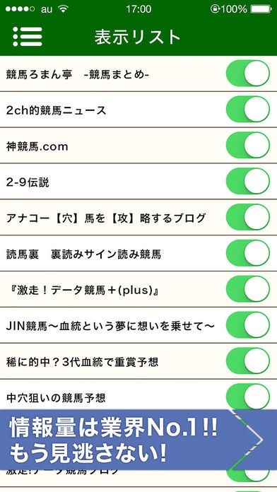 大量の競馬関連情報がひとつのアプリで読めるのは便利な反面、ときには大事な記事が埋もれてしまうこともありますが、「神競馬速報ニュース!」ではチェックしたいブログや掲示板をカスタマイズすることができます。これなら、馬券予想に特化したブログ記事だけを収集することも可能です。スピーディーな予想でキッチリ万馬券、これであなたもプロ馬券師!?