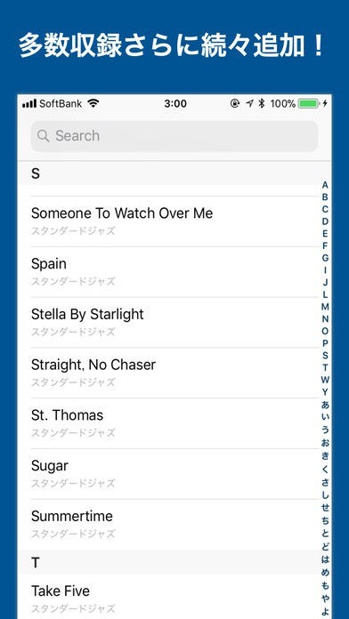 収録曲はアルファベット順・あいうえお順に並んでいて、曲の頭文字をタップするとその頭文字の一覧にジャンプできます。検索することもできるのですぐに目当ての曲を見つけられます。