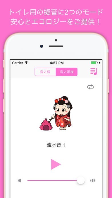 App Storeより引用公共施設やオフィス・学校などのトイレにトイレ用の擬音装置が設置されていない。あるいは従来の擬音装置ではちょっと心もとない。そんな時はこのアプリを利用すれば安心です。