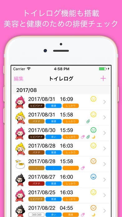 また、トイレ用の擬音を発生させるだけではなくトイレログ(便秘ログ)機能も搭載しています。日々の排便(お通じ)をチェックすることは美容と健康管理にはとても大切なこと。トイレを使用する際のお供にぜひご活用下さい。