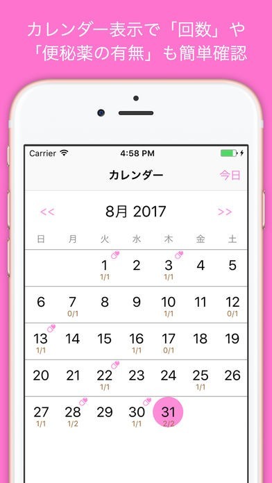 ・一覧表示だけではなくカレンダー表示で排便回数や便秘薬の使用有無なども確認できる
