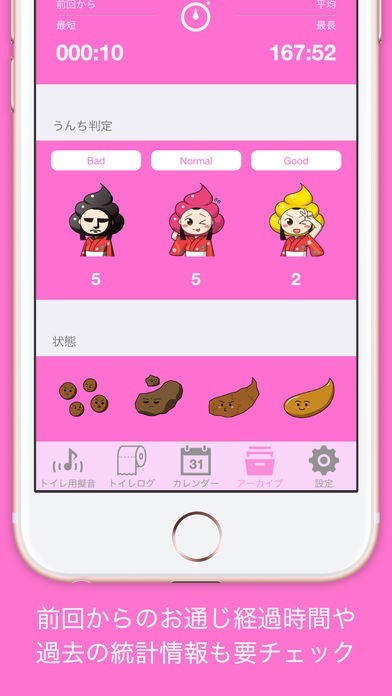 ・前回からのお通じの時間間隔や記録回数などを確認できるアーカイブ機能