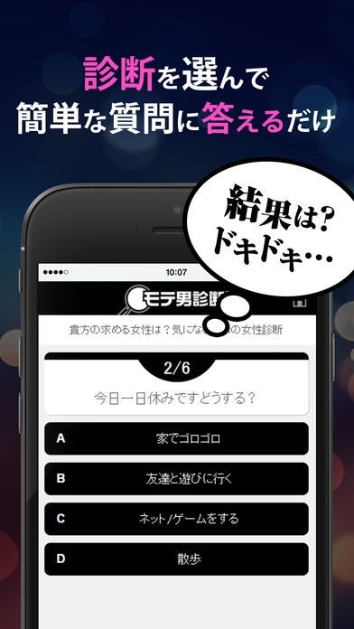 質問に答えていくだけでアプリがあなたのタイプを分析し、モテる男になる方法を導き出します!