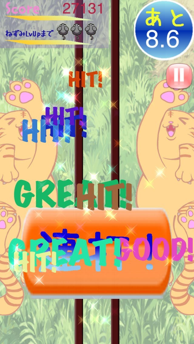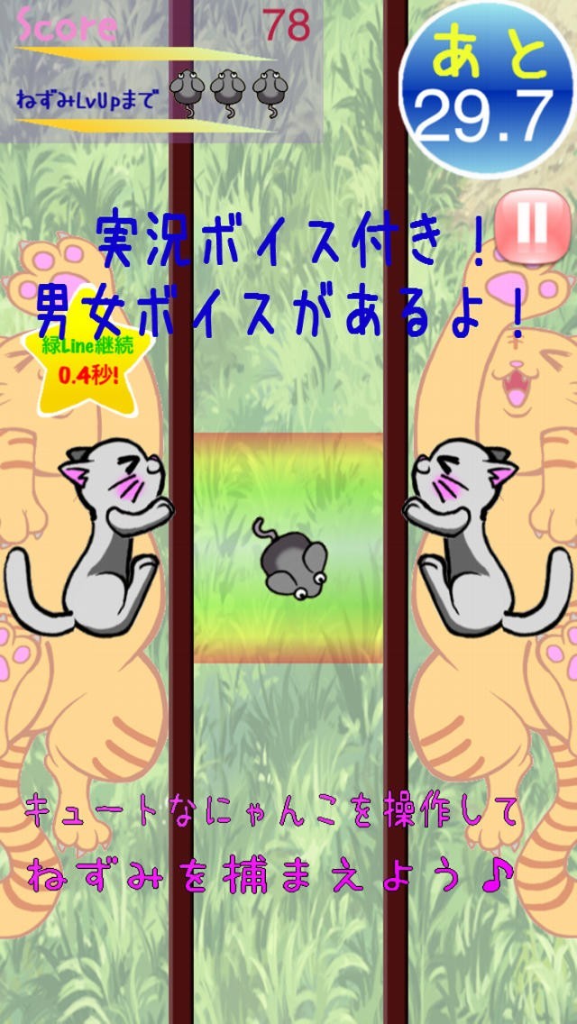 猫を操作してネズミを捕まえるゲームです。端末を上下に傾けて猫を動かします。猫に連動して枠も動き、ネズミを枠内に入れていると左右の壁が迫ってきてネズミを捕まえることができます。制限時間内に捕まえたネズミの数を競いますが、ネズミを捕まえると制限時間が伸びます。画面にアイコンが現れることもあり、タップするとボーナスゲームがは決まることもあり、ボーナスゲーム中はタップで連打します。 男女2種類のボイスでゲーム実況してくれるので盛り上がれます。