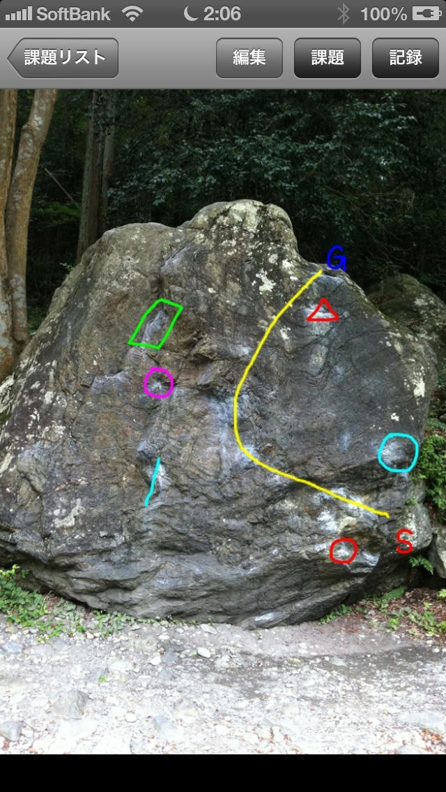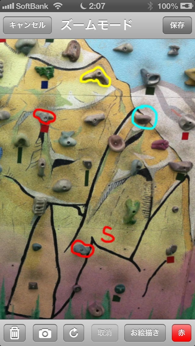 課題の写真撮影を行い、ラインを書いたり、ホールドにマーキングできます。