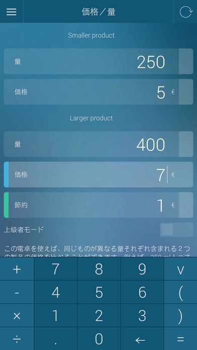 何を計算するのかの項目を選び数字入力をタップしていくだけで可能