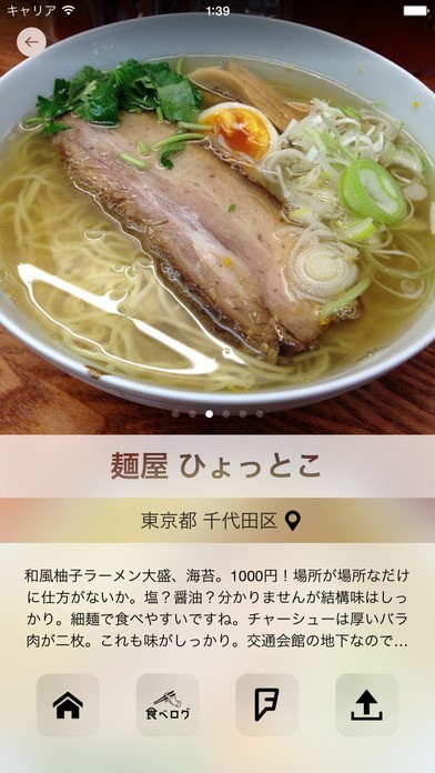このアプリの最大の特徴はと言えば、ラーメンの画像を入力するとそれから分析をして、好きそうなラーメンを出すお店を紹介してくれます。よって、なかなか理想のラーメンに出会えないというような方に新たなアプローチ方法を提供してくれます。 それらをタップすることによって、大きなラーメン画像を見ることが出来、さらには丁寧な説明まで書かれているので、どのようなものか想像するには十分な情報を得ることができます。 さらには食べログへのリンクによって採点やクチコミなどの情報を得ることによってそのお店についてさらに詳しくなることができます。他にはフェイスブックボタンをタップすればすぐに投稿することができて仲間に知らせてみるといったこともできます。