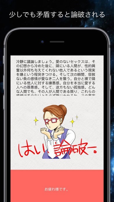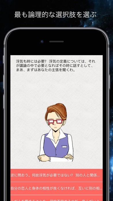 さまざまな話題について、適切な答えを選択する必要があります。まるで他人と真剣なディベートをしているかのような気分になることができるので、とても使い勝手が良いです。