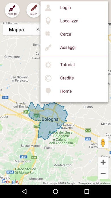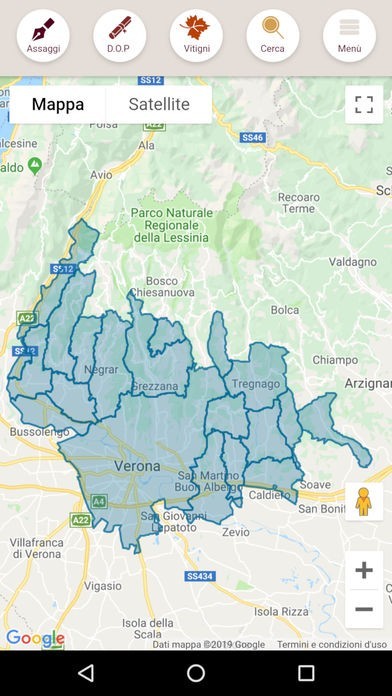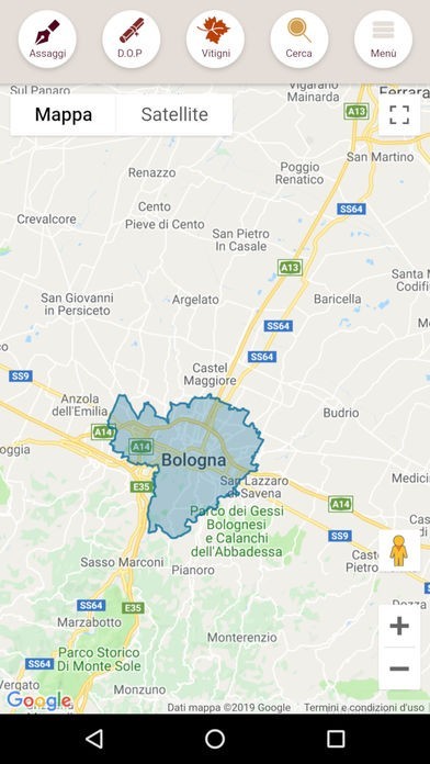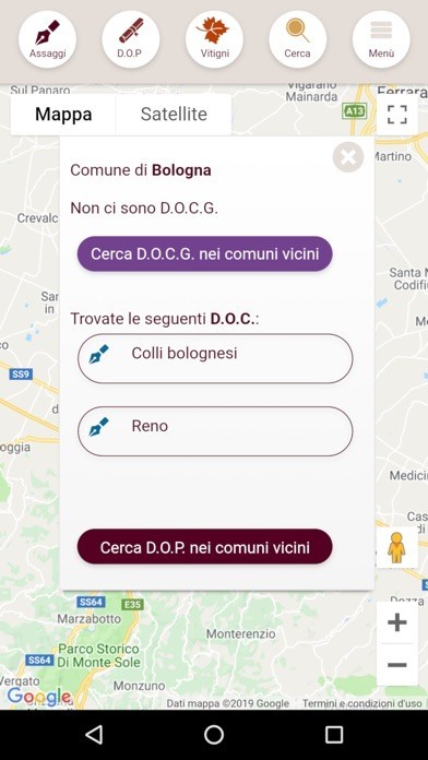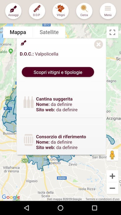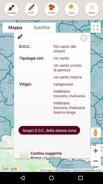 Scelta una DOP, l'app colora sulla mappa tutti i comuni in cui il vino viene prodotto così puoi facilmente individuare tutta l'area di produzione di una DOC/DOCG e conoscerne i dettagli.