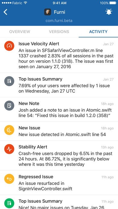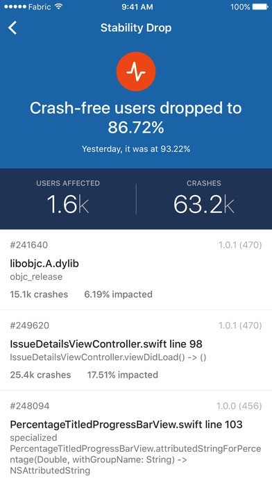 App Storeより引用Monitor your app on the go and get real-time analytics and crash reporting on your phone. Get alerted when something is critically affecting your app with the information you need to triage issues: