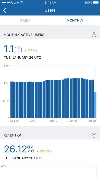 Always have access to your key metrics—track currently active users in real time and drill down on your crash-free and active user graphs to see your daily, monthly, and new users over time.