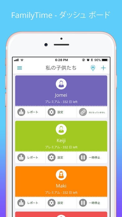FamilyTime – Dashboardはお子様のプロフィールを親御さんのFamilyTimeアカウントに追加することで組織また管理することができます。それぞれのお子様を別々の設定やペアレンタルコントロールで簡単に管理することができます。