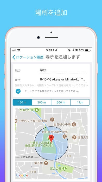 親御さんはお子様の位置情報をリアルタイムでモニターすることができ、設定した場所に入ったり、そこから離れたりすると通知されます。