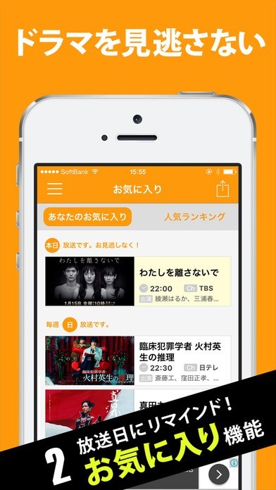 見ようと思っていたTVドラマついつい見忘れてしまうことが誰でもあると思います。このアプリを使えば見逃すことを撲滅できます。 まず、アプリを起動すると今日放送される予定のドラマが一目でわかるように画面に表示されます。フリックすれば昨日と明日のドラマも簡単に分かるようになっています。また見ようと思っていたドラマをお気に入り設定するとスマフォのプッシュ機能でお知らせが届けてくれます。情報を表示可能なのはNHKと民放5社局のドラマです。 その他機能としては、番組の公式サイトやYouTubeの関連動画も自動で検索してくれます、またアプリに掲示板の機能も搭載されているのでドラマの感想を交換もできるようになっています。新番組の告知などもあるので、ドラマが好きな人には機能満載の楽しめるアプリです。