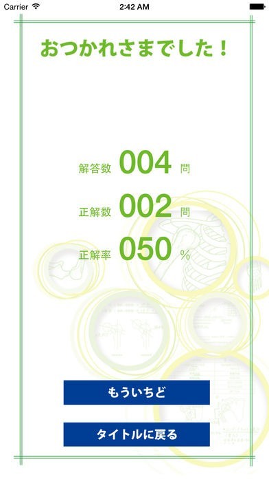 国家試験と同じ四択で、6分野から基礎問題50問・一般問題150問、全部で200問を収録しています。シャッフル、ポーズ、リターン機能で繰り返し解答でき、正解率で習熟度がチェックできます。