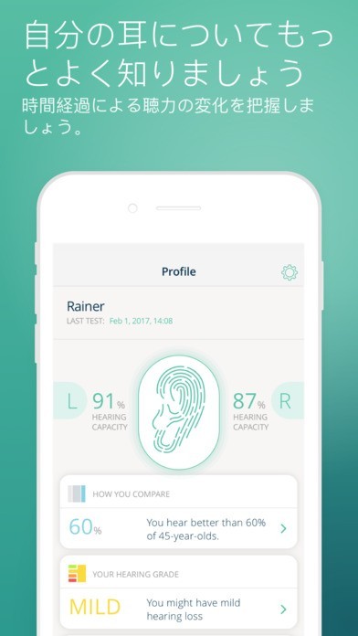 テレビや音楽を大音量で視聴している方は、聴こえている状態が当たり前なので聴力を意識しておらず、落ちていることにも気づきません。音が聞こえづらいと感じた方はこの「Mimi」を使ってみてください。100-12khzの幅広い周波数を利用した聴力診断が行えるアプリで、6分間の短いテストで現在の聴力をデータにして表示してくれます。そのデータも何歳程度の聴力なのかなど、分かりやすく見せてくれるので素人でも把握しやすいです。行った結果を元に再テストの通知をしてくれるなど定期的に聴力の状態をチェックできます。状態が良くないと診断されたときは聴力図をプリントアウトする機能もあるため、出力して耳鼻科へ向かいましょう。