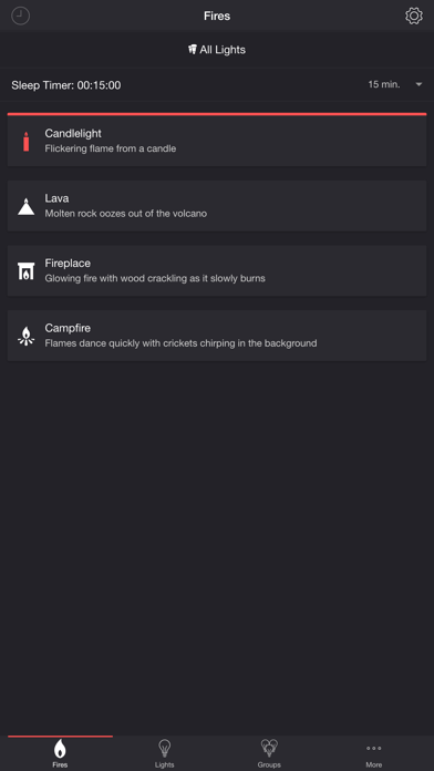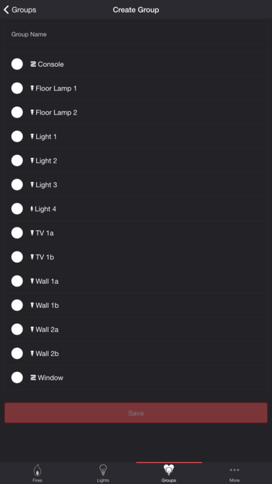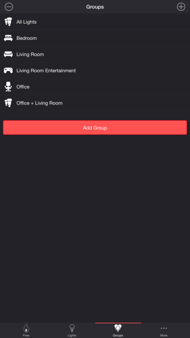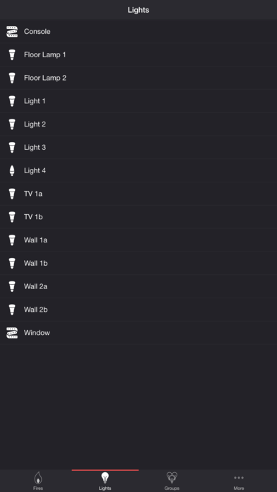 Select one or more lights for your fire light show on the Lights/Groups tab. Choose a group that you set up using your Philips Hue app, or create a new group in the Firestorm for Hue app. To edit a group in the list, swipe the item to the left and tap the pencil icon. When you add, remove, or change lights, pull down the list to refresh.