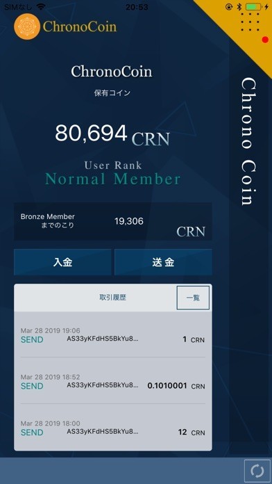 このツールはクロノコインという仮想通貨の残り残高を確認したり、指定した口座に送金することができます。パソコンを開かなくても操作が可能ですので手間がかかりません。