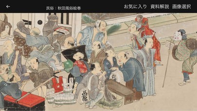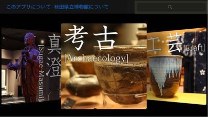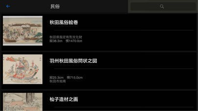 App Storeより引用「秋田県立博物館デジタル収蔵庫」は、秋田県立博物館が所蔵する重要文化財や資料を高精細画像で鑑賞できるアプリです。多種多様な資料の画像をタッチ操作で自由にスクロール、拡大・縮小して、作品の魅力をすみずみまで楽しめます。一部の絵巻などでは、巻頭から巻末まで連続した画像を掲載しました。スクロールしながら鑑賞する絵巻本来の楽しみ方を体験できます。また立体の資料は、複数の画像を掲載しており、様々な角度から見ることができます。