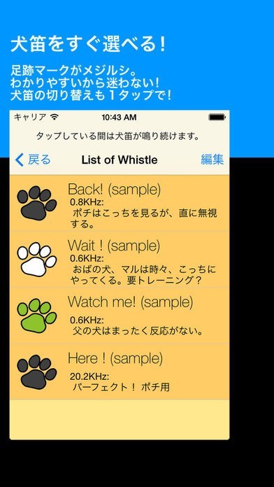 このアプリでは、ヘルツを調整して、あなたの愛犬に合った犬笛の音域を見つけることができます。いろんな音をアプリにたくさん登録することができるので、何回でも試すことができます。