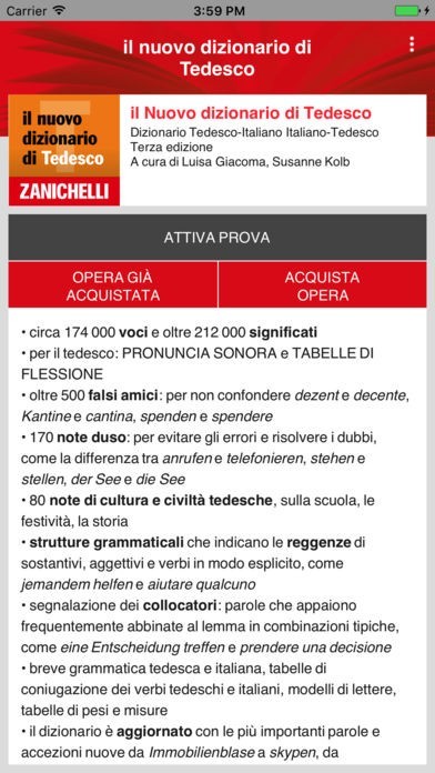 Puoi attivare una prova gratuita, che ti permette di effettuare 30 ricerche all’interno dell’intero dizionario, oppure puoi acquistare subito in modalità in-app.