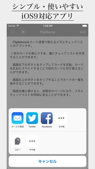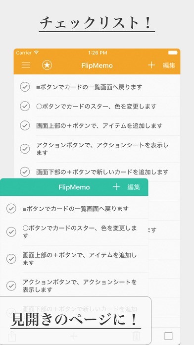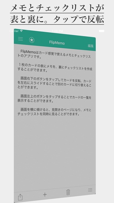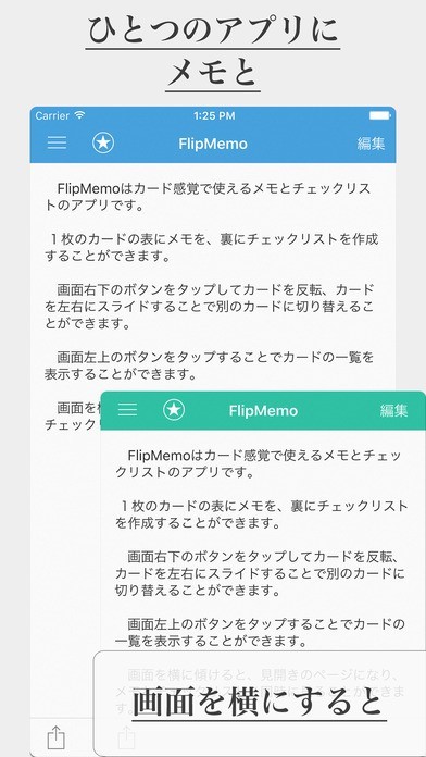 App Storeより引用1枚のカードの表と裏にメモとチェックリストを。画面を横に傾けると、その両方を一度に見ることができる見開きページに。FlipMemoはシンプルで使いやすいメモ・チェックリストアプリです。