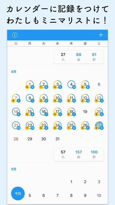 ・カレンダー画面では、ログのある日には、購入したものの総数、捨てたものの総数が表示されます。その月の合計はカレンダー下部に表示されます。