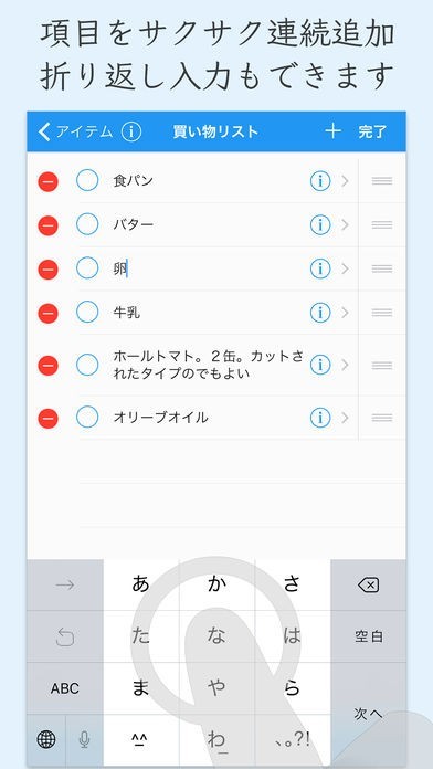 チェックリストを項目ごとに作成することができます。また、同一チェックリスト内の項目をさらに細分化させることもできます。また、チェックリストの応用範囲は広く仕事や旅行や買い物など幅広いシーンで活躍してくれます。