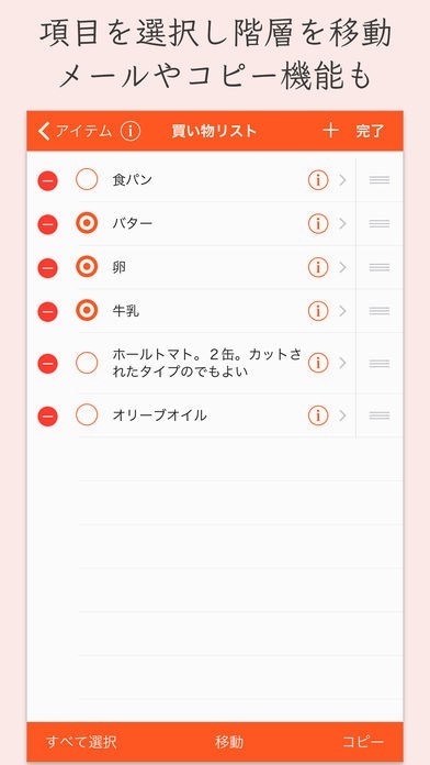 今日やるべきこと、忘れ物の確認リスト、お買い物リスト・・・などといったように、ToDoリストを複数に分けて管理したいと思ったことがある方は多いのではないでしょうか。この「Checklist 無料版 - チェックリストアプリ」は、ToDoリストをいくつでも階層化してすっきりと整理することができるToDoアプリです。たとえば、「お買い物リスト」の中に「食料品リスト」と「日用品リスト」を作り、それぞれに項目をまとめておくなど、ニーズに合わせていろいろな使い方ができます。