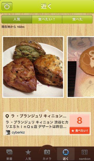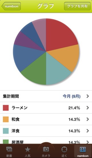 「Spoon!」では、飲食店の美味しい食べ物の写真を撮って共有することが出来るようにしてくれるので、自分が撮影した素敵な写真をアップロードする楽しさを感じることや、身近だけど行ったことが無いお店の画像を見ることも出来ます。 「人気」では、写真のみが表示されており、気になった写真をタップしてそのお店の情報を閲覧することが出来ます。 その中には、「食べたい」、「気になる」、「シェア」ボタンをタップすることでそれぞれを使うことが出来ます。 他にも「近く」では周辺の美味しいお店の情報を得られるので、すぐに何かを食べたい場合に役立ちます。 加えて、「nambon」ではグラフによってどんなものをどの程度の割合で食べているのかを円グラフで表示してくれるので、それを参考にして次の食べ物を決めたりも出来ます。