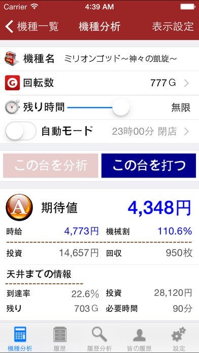 機種を選び、回転数と閉店時間を入力することで、期待値や天井までの情報など、スロット台選びに必要な情報を教えてくれます。閉店時間の代わりにスロットを打つ時間を1時間単位で入力することも可能です。