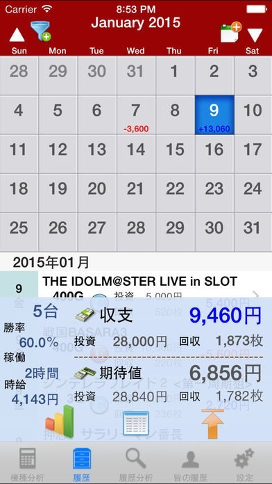 スロットの履歴管理機能を搭載しているため、どの機種をいつ打ったかを管理することができます。履歴管理では回収枚数や投入金額などのスロット管理に必要な項目を入力することができます。