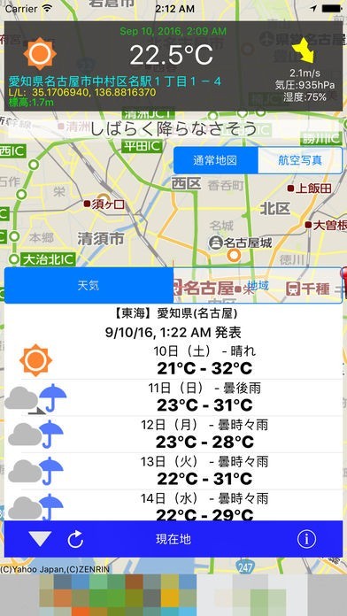今いる場所だけでなく、地図上の任意の場所の概算気温が測定できる便利なアプリです。外出先の最新の気温情報が知りたい時に、地図上で調べたい場所をクリックするだけなので操作はとても簡単。データは1時間に一度、毎時25分頃に更新されるので、常に新しい情報を得ることができます。天気予報や予想降水量、週間天気予報も確認できるのでちょっとした外出だけでなく旅行や出張時にも利用でき便利です。