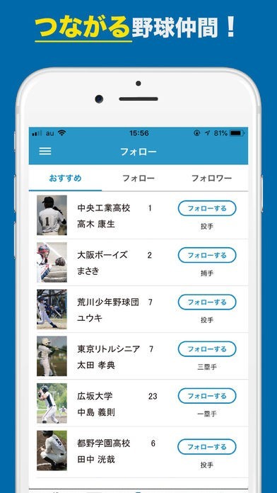 入力した記録は、アプリのSNS機能により、フォローしている野球仲間と共有することができます。「いいね」を押しあったりして、チーム内での共有はもちろん、離れた野球仲間とも繋がることができます。