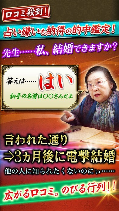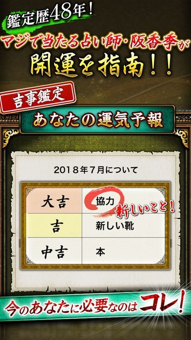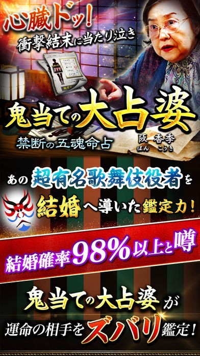 伝説の占い師・阪香季が占ってくれるアプリです。阪香季先生は、そのあまりの的中率の高さから鬼当ての大占婆と呼ばれるほどです。禁断の五魂命占いを中心にあらゆる事象をピタリと予想してくれます。