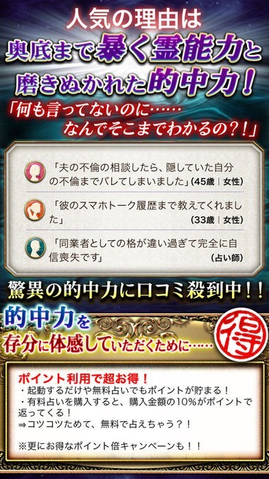 無料メニューが豊富です。占いの定番、恋愛系のメニューをはじめ、仕事や友人関係などさまざまな悩みに対応しているので、無料メニューで十分に霊視のすごさを実感することができます。
