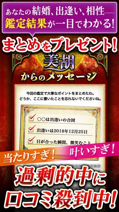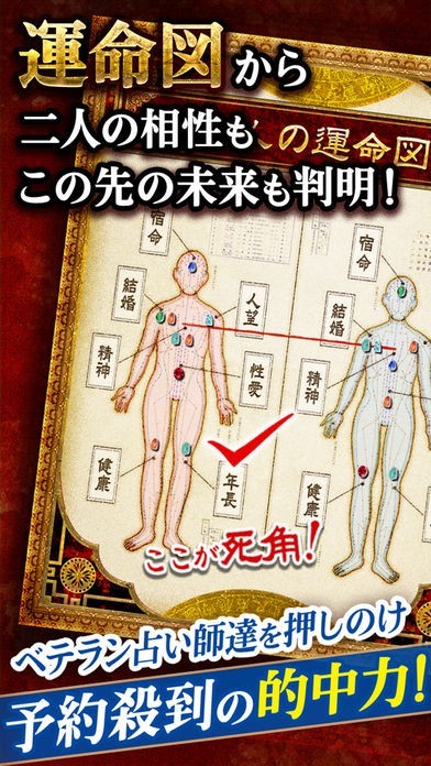 このアプリでは運命図を作ることで、ユーザーの運命や恋愛を詳細に解説します。運命を知りたい人には悩みの原因や見落としているポイント、恋愛について知りたい場合は、二人の「宿命」を曖昧さなしではっきりとお伝えします。