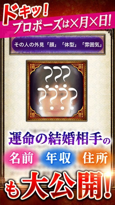 運命図を用いれば、人生のあらゆることを具体的に知ることができます。プロポーズの日は何日なのか、相手の名前や年収、住所は何なのか。他の占いアプリとは一線を画す、曖昧さのない占いを体験できます。